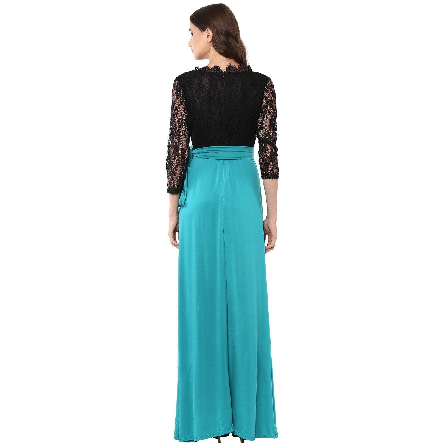 Cut to fit perfectly, this black and blue coloured evening gown from the house of Jaune is highlighted with front slit, making it look unique. The blend of 95% polyester and 5% spandex fabric offers superior comfort and sufficient stretchability. The waist sash and lace detailing on the bodice lends this gown an unmatched appeal. This gown will look best when paired with black coloured stilettos. This dress is made of Anti-Wrinkle, Breathable, Eco-Friendly, Anti-Pilling, Anti-Shrink Fabric. Model Stats : The Model has Height 5'6" , Bust 32" , Waist 24" , Hips 32" and is wearing Size S.